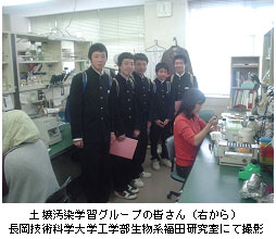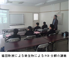 長岡技術科学大学福田研究室では、微生物を使った汚染浄化について学習しました。福田教授は世界で始めてPCB分解酵素を発見しました。中学生にはちょっとむずかったかな?